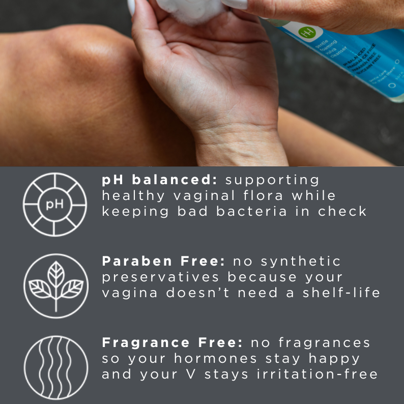 - pH Balanced Gentle Foaming Cleanser naturally supports the vulva’s delicate microbiome by preserving good bacteria and inhibiting harmful yeast overgrowth.